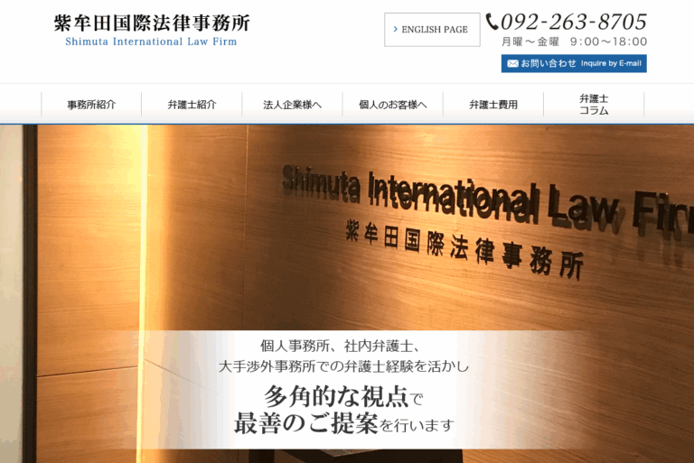 紫牟田国際法律事務所は、福岡市博多区住吉1丁目のキャナルシティ・ビジネスセンタービル9階に拠点を置く総合法律事務所です。JR博多駅・地下鉄中洲川端駅から徒歩圏内のアクセス利便性があり、平日9:00〜18:00に面談相談を受け付けています。代表弁護士・紫牟田洋志氏を中心に、企業内法務担当経験や海外留学・海外弁護士資格を持つ弁護士が所属し、多様な法的ニーズに対応しているのが特徴です。法人・個人双方の相談に応じ、地域社会に貢献する姿勢を掲げています。