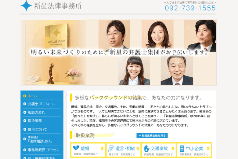 新星法律事務所は、福岡市中央区渡辺通2丁目に拠点を置く法律事務所です。2006年の創設以来、地域の相談者の困りごとを法的に解決することを目標に、多様なバックグラウンドを持つ弁護士が在籍し、一般民事から家庭・労働・企業法務まで幅広い相談に応じています。離婚・慰謝料・親権問題といった家事事件や遺言・相続関係、借金・債務整理、交通事故による損害賠償請求、土地や労働関係のトラブルなど、日常生活や事業で直面する法的課題を包括的に扱っています。