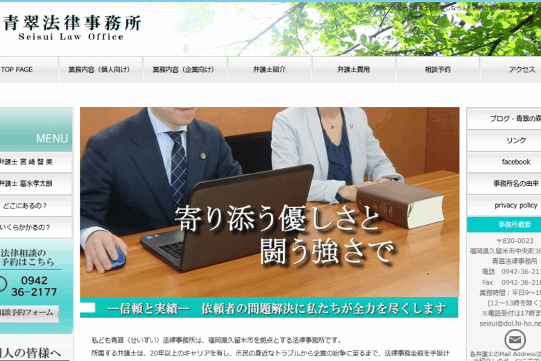 青翠法律事務所は、福岡県久留米市中央町に事務所を構える法律事務所で、個人・法人の多様な法的ニーズに応える総合的なリーガルサービスを提供しています。所属弁護士は20年以上のキャリアを有し、民事事件、家事事件、労働問題、交通事故、債務整理・破産等の個人向け事件から、企業法務・労務管理・債権回収といった法人向けの法務支援に至るまで幅広く取り組んでいます。