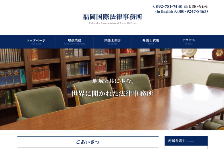 また、弁護士は福岡県弁護士会にも属し、国内法務だけでなく国際法務についての知見も有している点が特徴です。相談は原則予約制となることが一般的で、初回相談料や扶助制度(法テラス)を利用した相談の案内も行っています。個人の生活法務から企業の国際取引支援まで柔軟に対応する法律事務所として、依頼者の不安を軽減し、迅速・誠実な法的支援を目指しています。