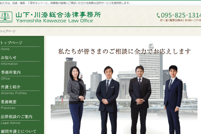 山下・川添総合法律事務所は、長崎県長崎市万才町の第1森谷ビル8階に事務所を構える法律事務所です。依頼者満足を重視し「迅速・確実・丁寧」をモットーとして法的サービスを提供していると説明されています。