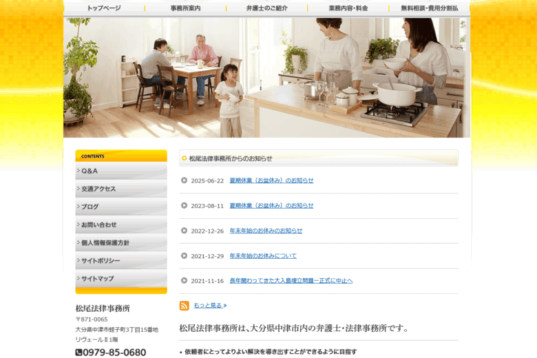 松尾法律事務所は、大分県中津市を拠点に、地域の皆さまの多様な法的トラブルに対応する「身近な法律の味方」です。民事問題・債務整理・家事(離婚・相続など)・刑事事件・行政問題まで幅広く取り扱っており、交通事故や建築・不動産、労働トラブル、消費者問題など、生活に関わる様々な問題にも対応しています。