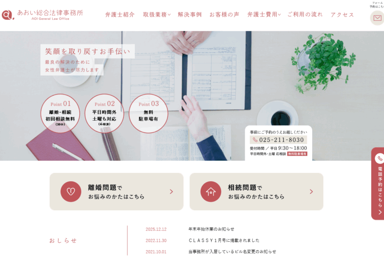 事務所紹介では、女性弁護士が対応すること、具体例を用いて分かりやすく説明すること、明るくきれいな空間づくりを意識していること、依頼前の段階で弁護士費用をできる限り明確に示すこと、離婚や相続の成立後に必要となる手続きを支えるアフターフォロー・プランを用意していることが挙げられています。離婚や相続を中心に、相談時の環境や手続き後の支援まで含めて案内している新潟市中央区の法律事務所として整理できます。