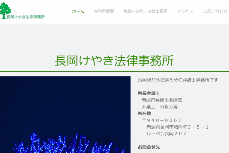 長岡けやき法律事務所は、新潟県長岡市城内町にある法律事務所です。所長弁護士の杉森芳博氏が所属しており、企業法務、交通事故、相続、離婚、借金問題など幅広い分野の法律相談を受けています。JR長岡駅から徒歩圏内に位置しており、長岡地域で法律相談を行う拠点の一つとして運営されています。