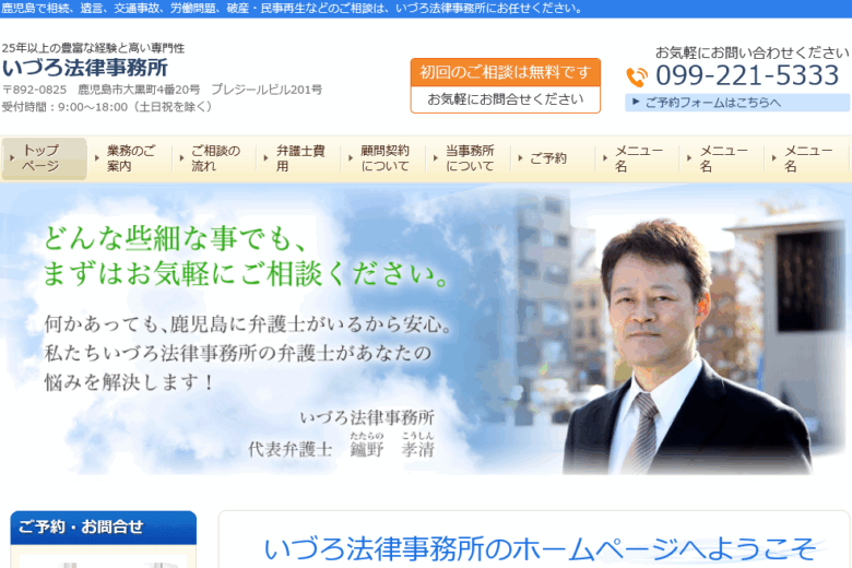 いづろ法律事務所は、鹿児島市大黒町に事務所を構える法律事務所です。相続や遺言、交通事故、労働問題、破産・民事再生など、個人や企業が抱える幅広い法律問題に対応しており、鹿児島で法律相談を受け付けています。地域の法律問題に向き合う窓口として、さまざまな相談に対応しています。