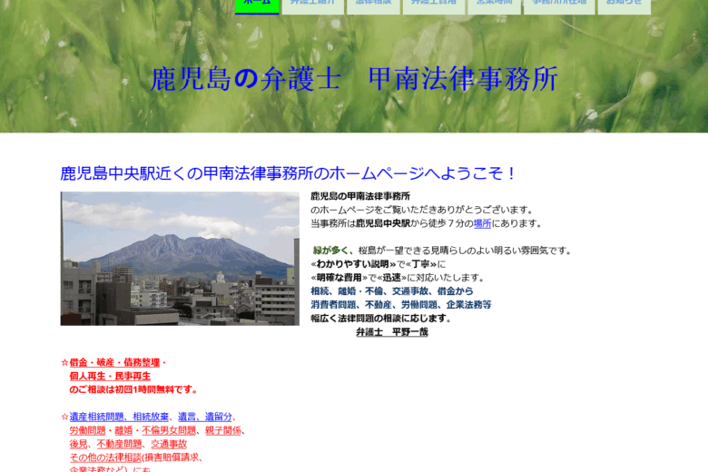 甲南法律事務所は、鹿児島県鹿児島市上之園町に事務所を構える地域密着型の法律事務所で、鹿児島中央駅から徒歩約7分のアクセス便利な場所にあります。弁護士 平野一哉が代表を務め、離婚・養育費・親権、親子関係(認知等)、男女問題・不倫、遺産相続・遺産放棄、遺言・遺留分、認知症問題・成年後見、交通事故、借金・破産・債務整理、個人再生、解雇・未払い賃金などの労働問題、不動産の賃貸借・売買問題、そして企業法務まで、生活者・事業者双方の法律相談を広く受け付けています。