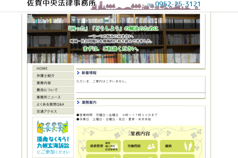 また、事務所に在籍する弁護士には、労働事件・家事事件・消費者被害などに強みを有する者もおり、それぞれの分野に応じた実務経験を踏まえた対応をしています。相談は電話予約制で、来所前の案内を徹底しており、初めて弁護士に相談する方でも安心して問い合わせができる体制を整えています。佐賀市中心部という立地からアクセスも良く、地域の法律ニーズに応える総合的なリーガルサービスを提供しています。