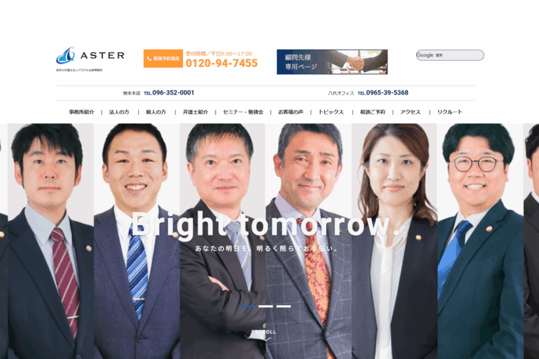 弁護士法人アステル法律事務所は、熊本県熊本市中央区花畑町の大樹生命熊本ビル7階に本店を構える地域密着型の総合法律事務所です。県内では熊本本店に加え、八代市にも支店を持ち、複数の弁護士が所属する大規模事務所として幅広い法的ニーズに対応しています。代表や所属弁護士は、交通事故や離婚・家事事件、債務整理・過払い金回収、遺言書作成・相続対策、労働問題、法人の顧問契約・契約書作成・債権回収など、多岐にわたる法務分野を取り扱っていると紹介されています。