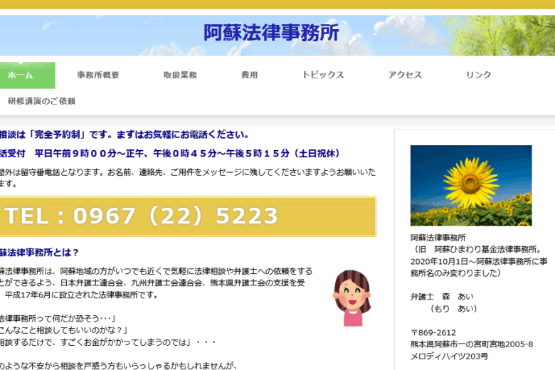 阿蘇法律事務所は、熊本県阿蘇市一の宮町宮地に拠点を置く地域密着型の法律事務所で、旧称「阿蘇ひまわり基金法律事務所」として平成17年(2005年)6月に設立されました。日本弁護士連合会、九州弁護士会連合会、熊本県弁護士会の支援を受けて設立され、阿蘇地域の人々が気軽に法的相談や弁護士への依頼を行える場として機能しています。代表弁護士は森あい氏で、熊本県弁護士会所属として、地域の暮らしに密着した法律問題の解決に取り組んでいます。