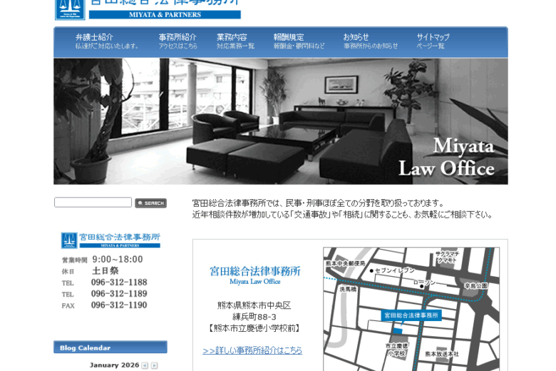 宮田総合法律事務所は、熊本県熊本市中央区練兵町に位置し、地域の法的ニーズに幅広く対応する法律事務所です。一般民事関係(損害賠償・不動産等)、商事・労働関係、破産・再建、家事事件、刑事・少年事件など、多岐にわたる分野の相談に応じています。相談室はプライバシーに配慮した静かな空間が用意されており、誰にも会うことなく落ち着いて相談できる環境が整えられていると説明されています。