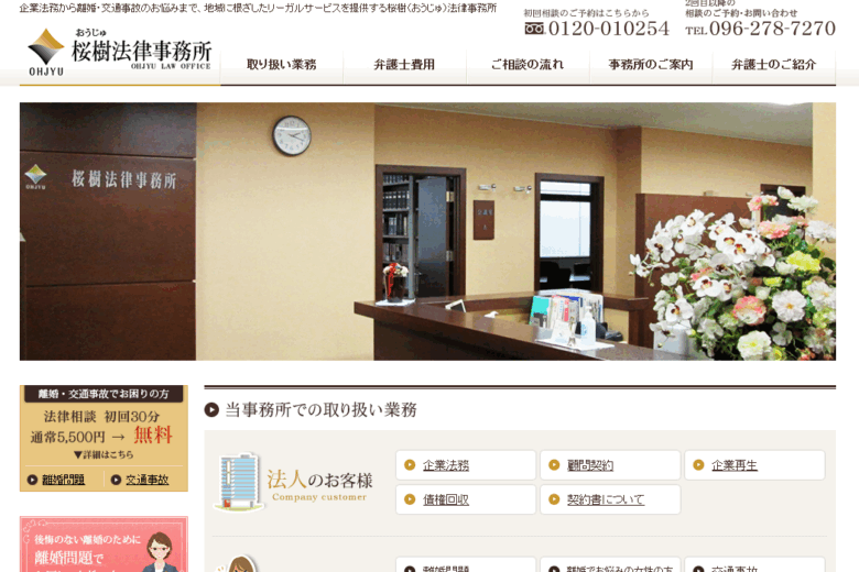 桜樹(おうじゅ)法律事務所は、熊本市中央区水道町に事務所を構える総合型の法律事務所で、企業・個人を問わず幅広い法的ニーズに応える体制を整えています。公式サイトによると、商事・企業法務、民事一般事件、家事事件、事業再生・倒産関係、行政事件、刑事事件など、多岐にわたる分野をカバーしており、企業のコンプライアンスや契約書作成、労務対応に関する相談にも対応可能です。複数の弁護士が所属していることにより、チーム体制で迅速かつ多角的なリーガルサービスを提供している点が特徴です。
