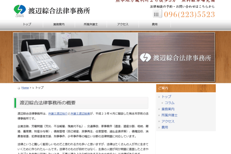 渡辺綜合法律事務所は、熊本県熊本市中央区京町2丁目2-37 伸京ビル1階にある総合法律事務所で、平成23年(2011年)4月に弁護士 渡辺裕介 氏と 渡辺絵美 氏によって開設されました。熊本地方裁判所から徒歩圏内に立地し、誰もが相談しやすい身近な存在として地域に根ざしたリーガルサービスを提供しています。