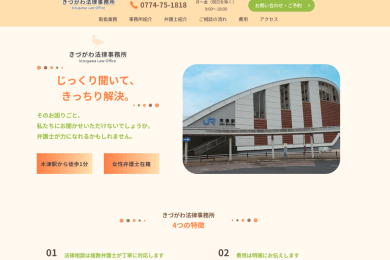 きづがわ法律事務所は、京都府木津川市木津駅前にある法律事務所で、日常生活やビジネスで起こるさまざまな法的な悩みに対して相談・解決支援を行っています。事務所の基本方針は、依頼者の話をじっくりと聞いたうえで的確な解決策を提示することであり、複数の弁護士が相談に対応することで多角的な視点から事件を検討しています。駅から徒歩1分というアクセスの良さと、女性弁護士在籍という特徴により、幅広い相談者が利用しやすい環境を整えています。