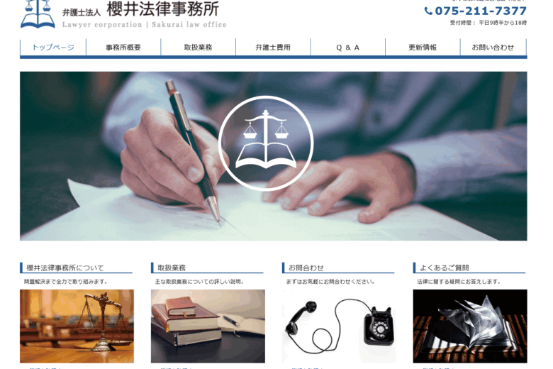 弁護士法人 櫻井法律事務所は、京都市中京区河原町通竹屋町上るに事務所を置く法律事務所です。代表弁護士のこれまでの実務経験を基盤に、依頼者の視点に立った丁寧な対応を心がけ、生活や企業活動に関わるさまざまな法的課題に対応しています。特に交通事故の損害賠償請求に注力しており、示談交渉や訴訟手続を通じて適正な損害回復を目指す支援に力を入れています。重度の後遺障害が残ったケースについて成年後見人としてサポートした実績もあり、後遺障害の有無にかかわらず、救済に向けた取り組みを進めています。