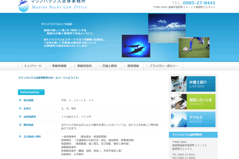 公式サイトのデザインには、イルカが知恵と平和の象徴とされる由来も掲載されており、相談者の安心感を大切にする理念を表しています。マリンバックス法律事務所は、宮崎市周辺の個人・法人にとって身近な法律パートナーとして信頼されています。